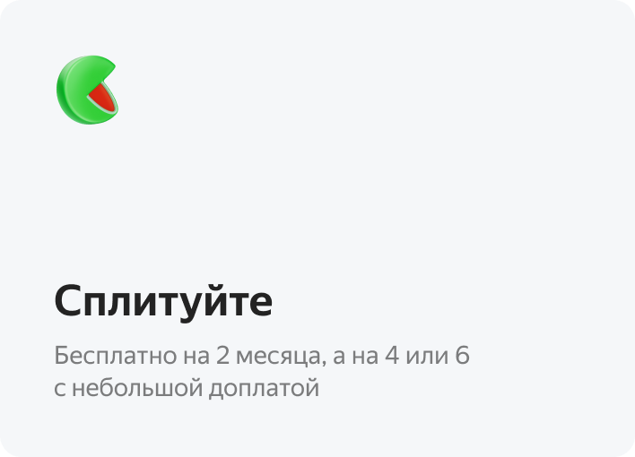 Если вы выбираете сплит на 2 месяца, то никаких переплат нет. За сплит на 4 или 6 месяцев мы берём небольшую комиссию — вы увидите её сразу, когда будете выбирать срок сплита.
